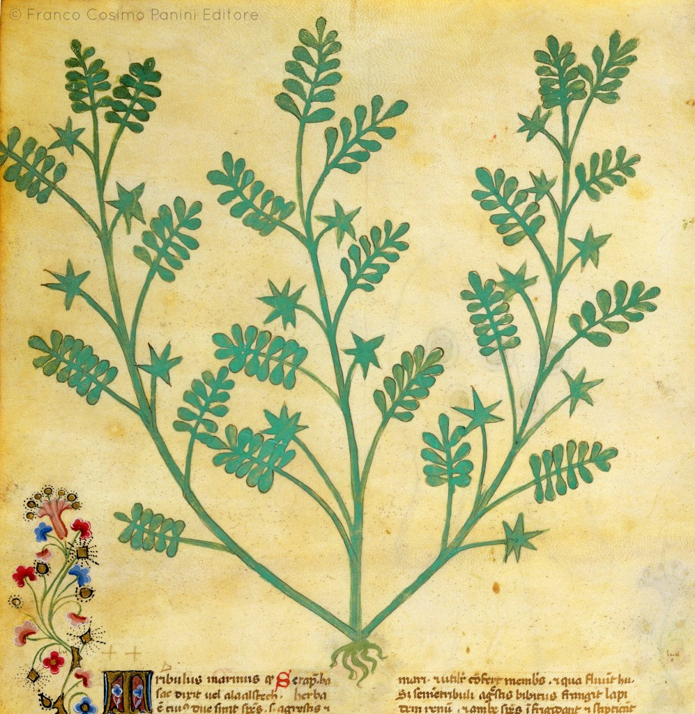 "Il tribolo marino nasce nei luoghi sabbiosi e marittimi: se si mischia con il miele cura la putredine e le ulcere della bocca e delle gengive. Il suo decotto spruzzato sui luoghi dove si trovano le pulci le uccide. Se si beve con il vino giova contro le medicine che provocano la morte."