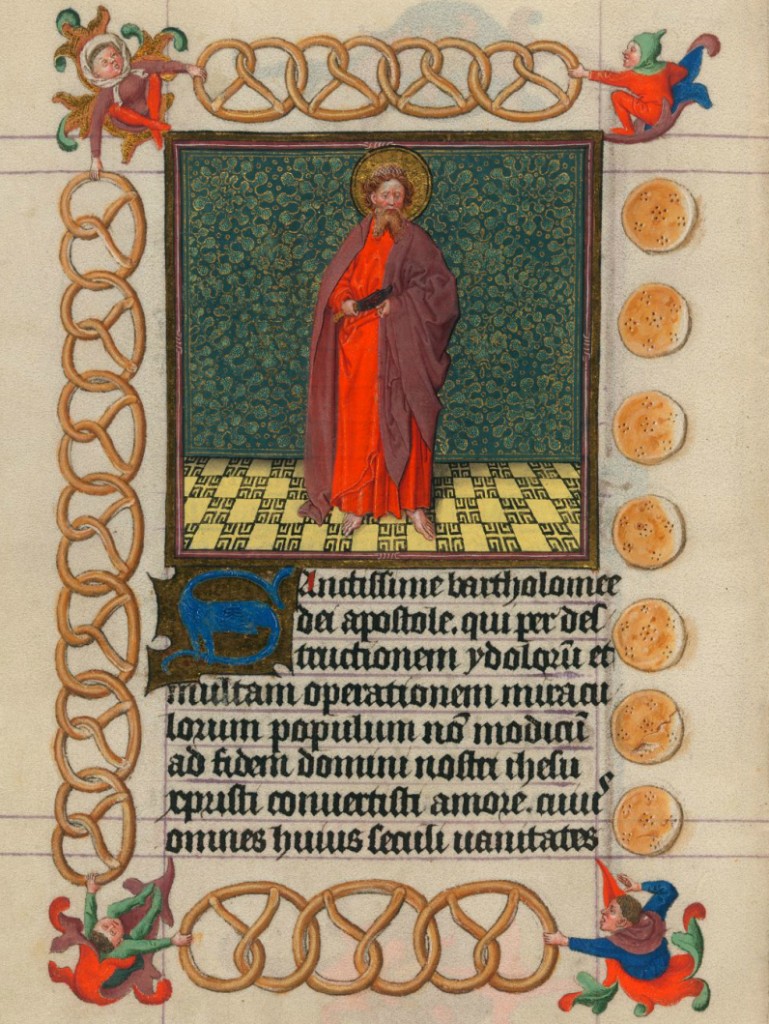 "San Bartolomeo con cornice di pretzel e cracker", miniatura tratta dal ‘Libro d’Ore di Cathèrine de Clèves’ (1440 circa), Morgan Library & Museum, New York.  Il rapporto tra questi prodotti da forno e l'apostolo Bartolomeo è sconosciuto.