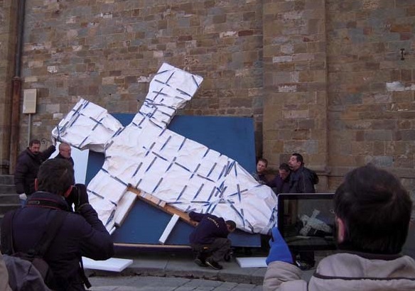 Al via lo spostamento del celebre crocifisso di Cimabue simbolo delle opere d’arte danneggiate dall’alluvione di Firenze del 1966. La grande croce dipinta è stata staccata dai supporti del cenacolo di Santa Croce ed è stata messa in posizione orizzontale in un ambiente non aperto al pubblico.Si tratta del primo atto del suo trasloco nella sacrestia della basilica, dove il crocifisso sarà sistemato ad un’altezza congrua, dunque al riparo da altre calamità simili a quella della grande inondazione di 47 anni fa: fino ad ora il crocifisso di Cimabue è stato sospeso a diversi metri di altezza con un sistema di carrucole, in modo da poterlo alzare in caso di allarme.