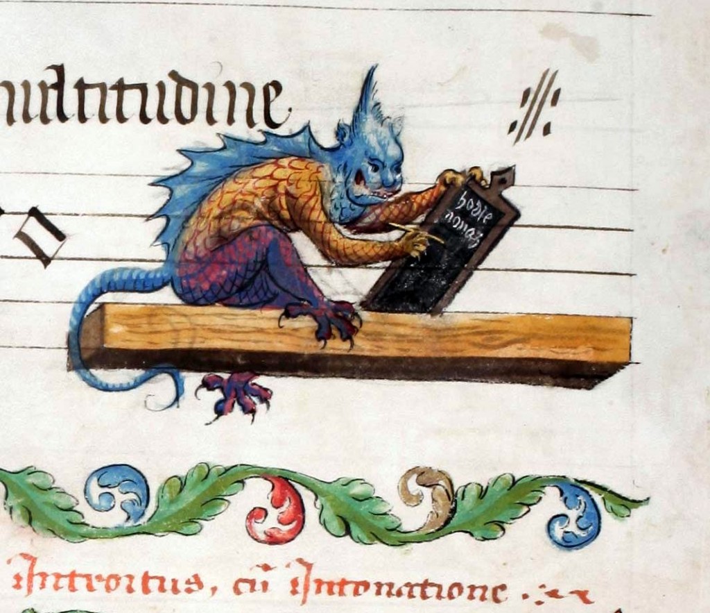 "Diavolo che scrive sulla lavagnetta le parole Hodie nonam", miniatura tratta da 'Canti a quattro voci per le principali festività dell'anno liturgico' (1562), Biblioteca dell'Abbazia di San Gallo, Svizzera.