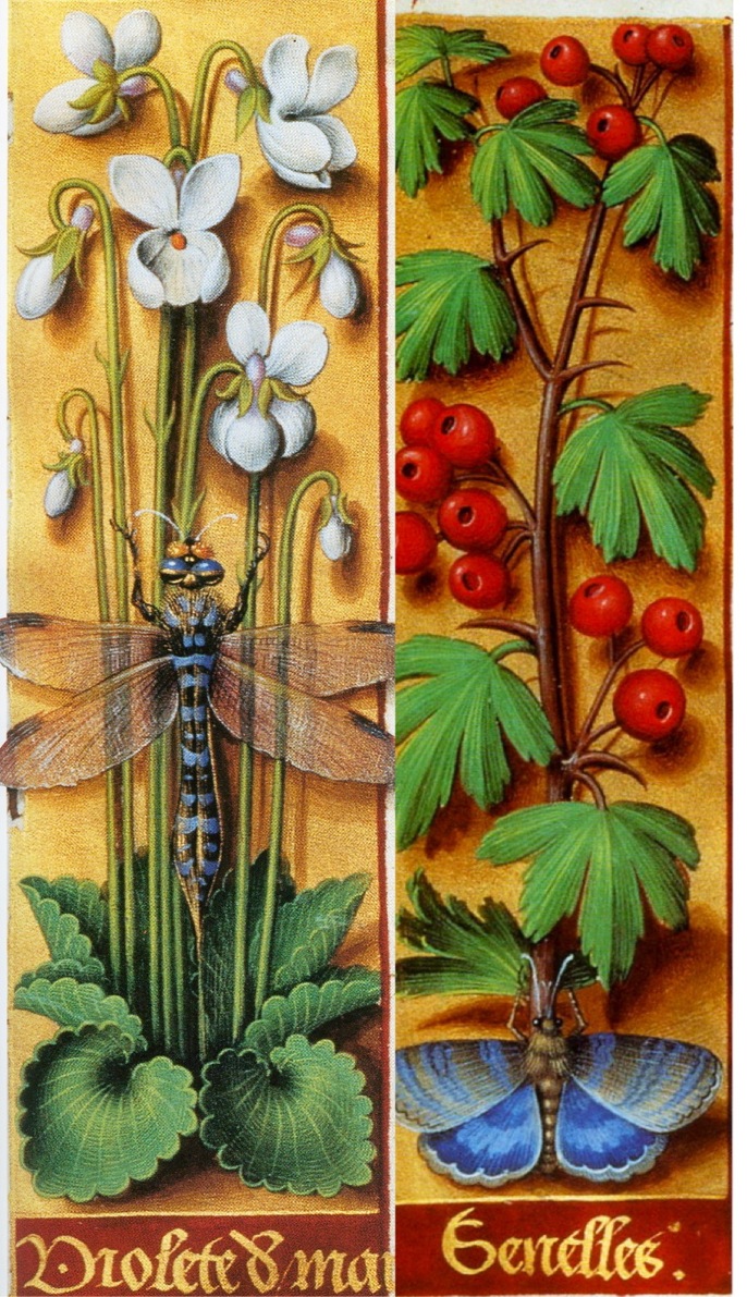 Due immagini dalle Grandes Heures d’Anne de Bretagne, la violetta bianca, simbolo di umiltà e di modestia, e il biancospino, portatore di felicità.