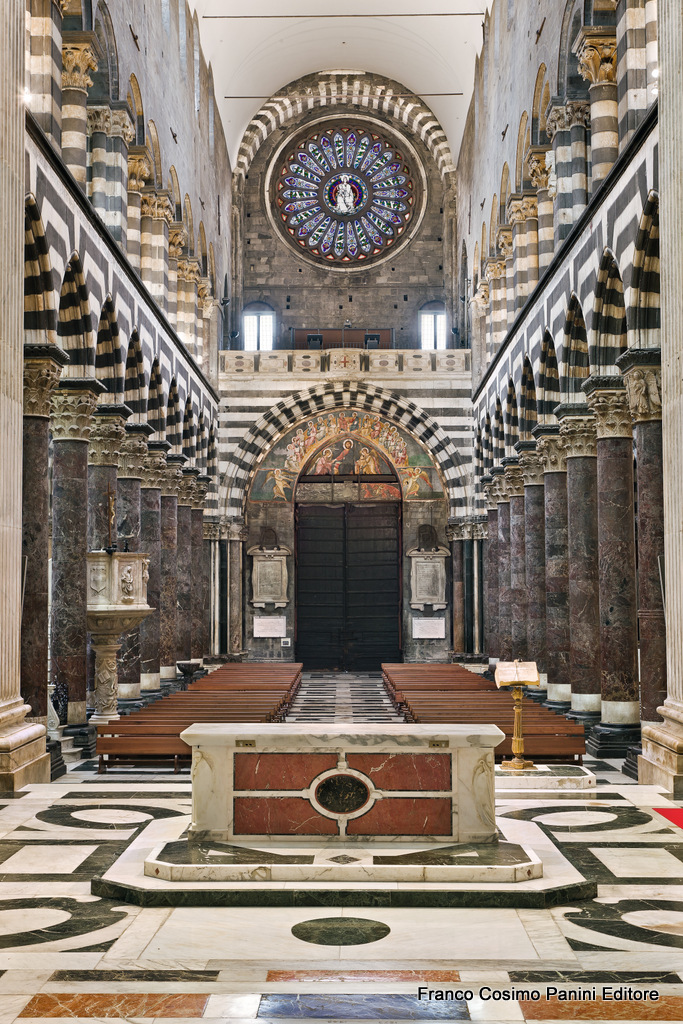 "L’intensità e la sapienza del reimpiego di monumenti antichi a Genova fanno eco ad analoghe esperienze, che a Modena e più ancora a Pisa avevano esaltato la memoria di una romanità perduta, che si voleva far rinascere, incarnandola anche a Genova entro una vibrante trama di “citazioni” monumentali, a cominciare dalle fronti di sarcofago. Come a Pisa, in un reciproco controcanto che era accanita rivalità municipale, ma anche consonanza di principi e di finalità, il Duomo di Genova diventa anche luogo di celebrazione, guerresco e religioso insieme, delle vittorie contro i Saraceni; e negli accumuli del Tesoro oggetti di origine islamica si mescolano al Pallio di San Lorenzo e ai doni di devozione privata; mentre nella cappella del Battista la preziosissima reliquia del Santo innesca una sfarzosa sinfonia di marmi policromi e scolpiti."