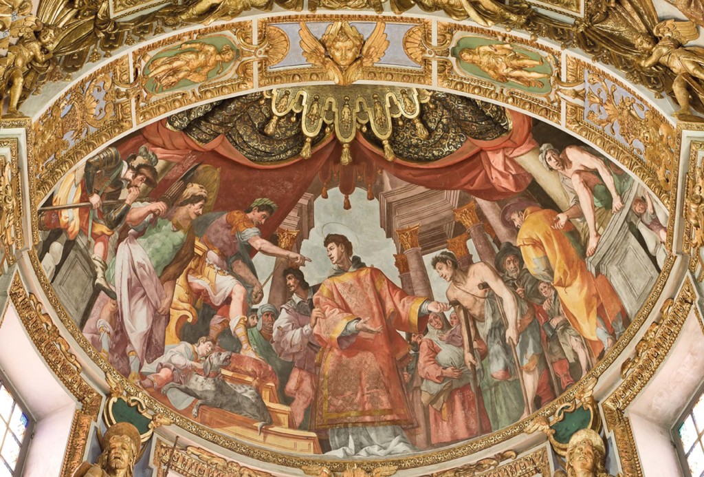 Genova, Duomo, interno, abside centrale, catino: “San Lorenzo indica i poveri come tesoro della Chiesa”, di L. Tavarone (1622 – 1624).