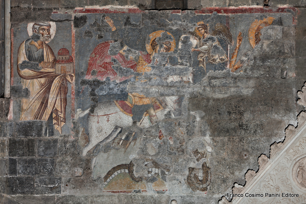 Genova, Duomo, interno, navata sinistra, seconda campata: lacerti di affreschi tra il portale di San Giovanni e la Cappella De Marini. Si distinguono S. Pietro, S. Giorgio a cavallo e un angelo. Ignoto pittore bizantineggiante, circa 1300. mnb@ 110 111