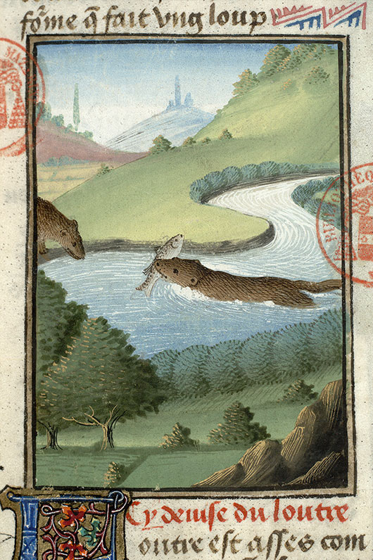 "Lontre", miniatura tratta dal 'Livre de la chasse de Gaston Phébus' (precedente al 1476), Bibliothèque Mazarine, Parigi.