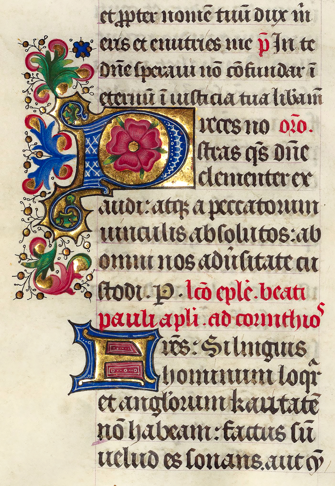 Initial "P", illumination from the manuscript "Missale ad usum ecclesiae Aquensis", ms. NAL 2661, f. 50v, 1466, Bibliothèque Nationale de France, Département des manuscrits, Paris.