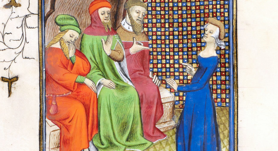 "Cornificia", illumination from the manuscript “De Mulieribus Claris”, decorated by Robinet Testard, ms. Français 599, f. 72v, 1488-1496, Bibliothèque nationale de France, Département des Manuscrits, Paris.