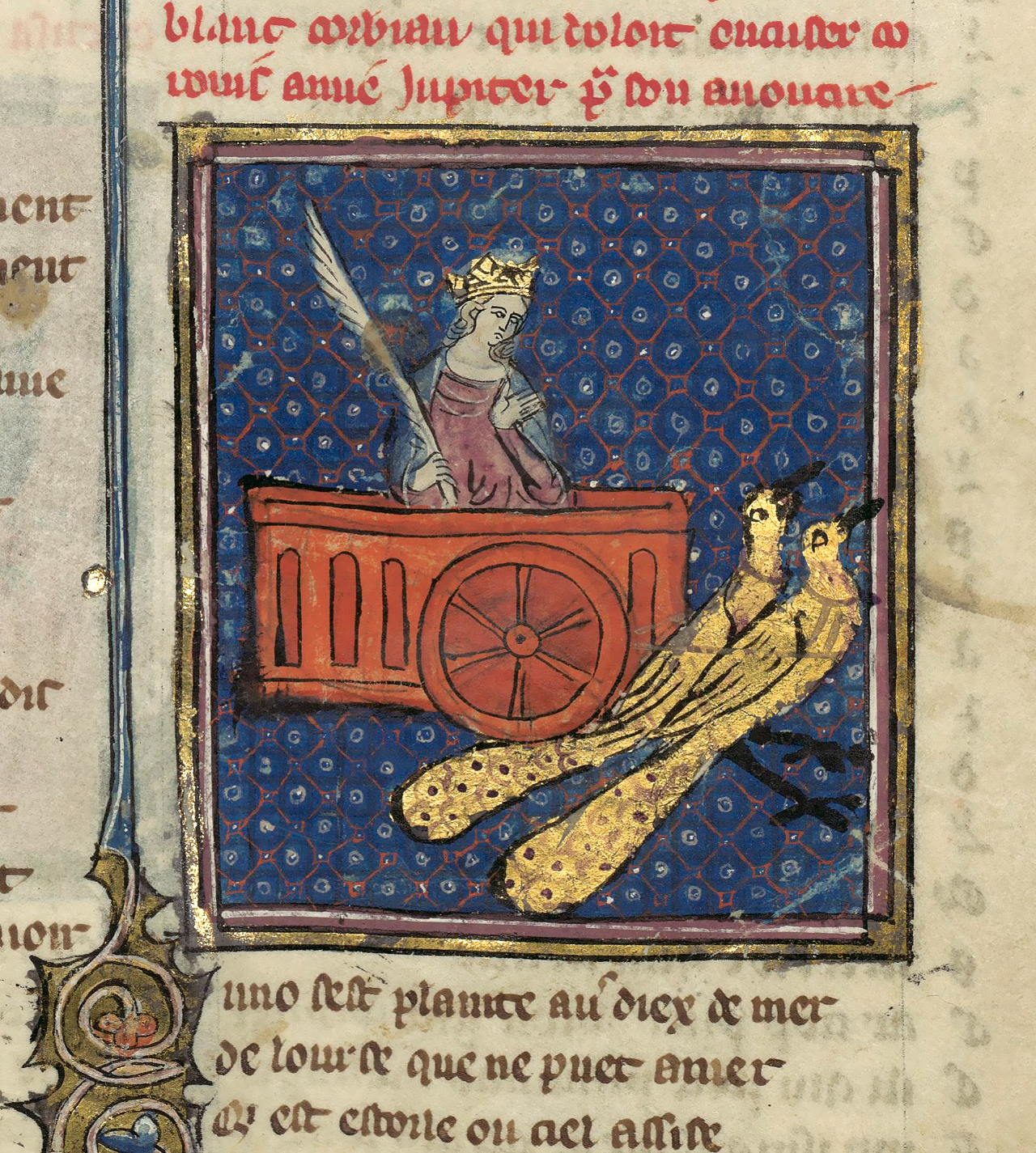 "Juno", illumination from the manuscript "Le romant des Fables Ovide le Grant", ms. 5069 réserve, f. 17r, 1301-1325, Bibliothèque nationale de France, Paris.