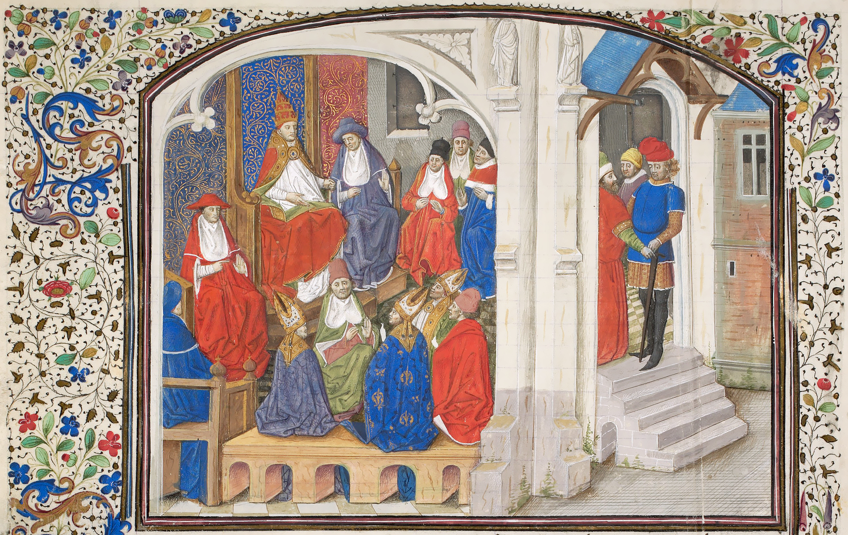 "Council of Clermont presided by Urban II", illumination from the manuscript "Histoire des Croisades traduite en français" by Guillaume de Tyr, ms. fr. 85, f. 12v, around 1460-1465, Bibliothèque de Genève, Geneva.