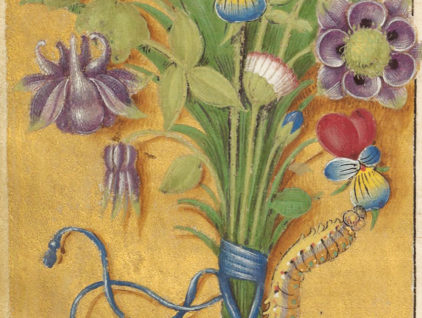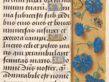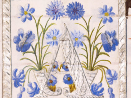 "Strawberries and pansies", illuminated initial F from an epistolary manuscript, use of the Priory of Saint-Martin-des-Champs, ms. 0437, f. 001r, second half of the 15th century, Bibliothèque Mazarine, Paris.