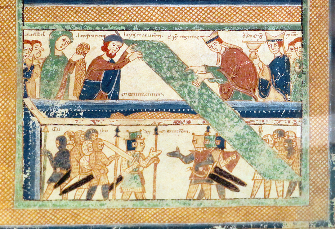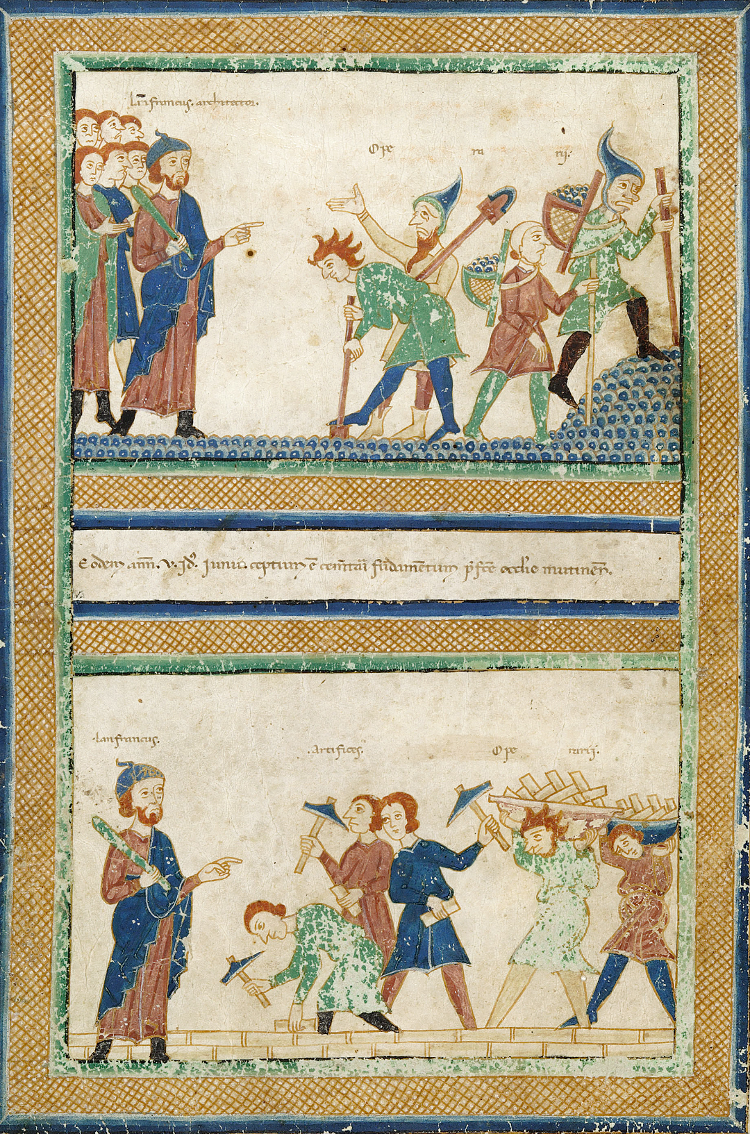 The illuminations included in the Relatio represent a chronicle of the very facts narrated in the manuscript itself: Lanfranco himself, in fact, is shown directing the construction - the workers first laying the foundation of the church (on top) and then raising a wall (bottom). In folio 9r, the encounter of Countess Matilda with the Pope and the transfer of the relics of Saint Geminianus.