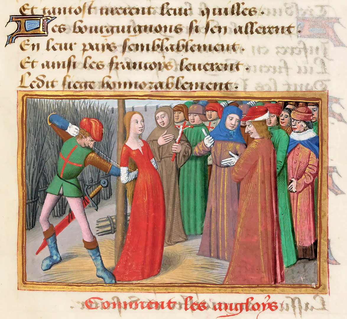 "Joan of Arc tied to the stake", illumination from the manuscript "Les Vigiles de Charles VII" by Martial d'Auvergne, ms. Français 5054, f. 71r, 1484, Bibliothèque Nationale de France, Paris.