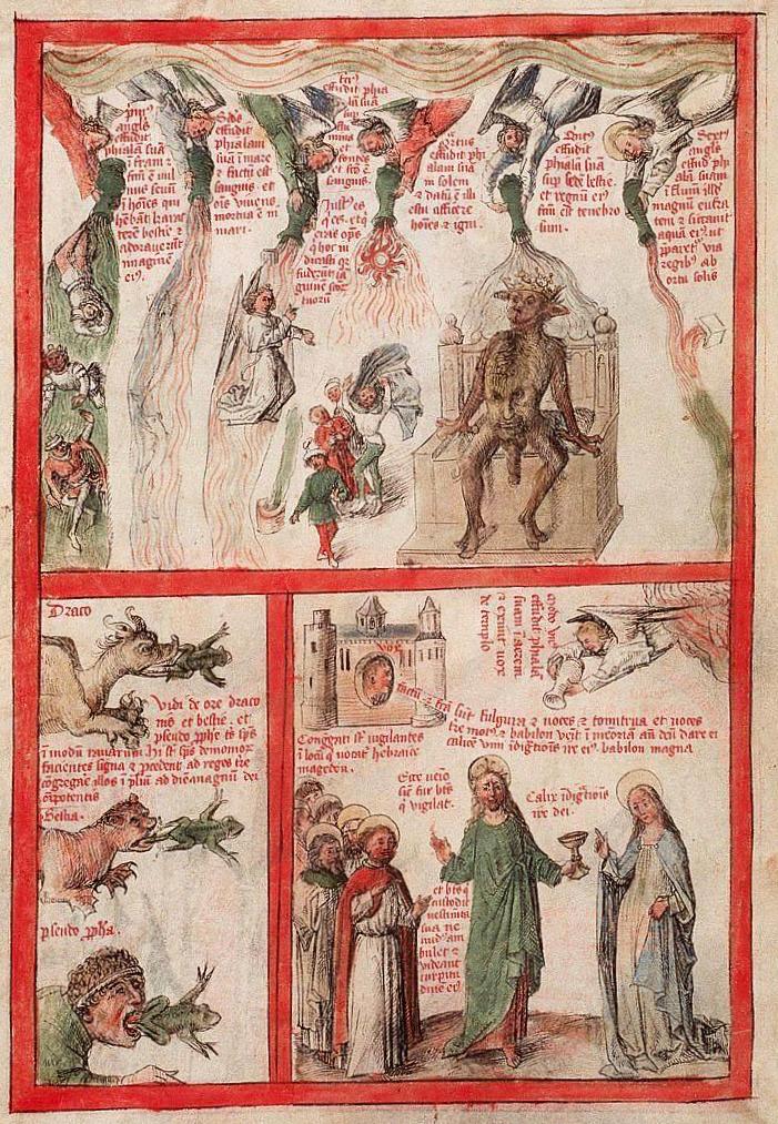 In basso a sinistra: Tre spiriti immondi simili a rane escono dalla bocca di un drago, di un animale e di un falso profeta.