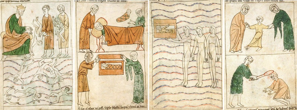 "Mosè salvato dalle acque", miniature tratte da Bibbia illustrata (1197), Bibliothèque municipale, Amiens.