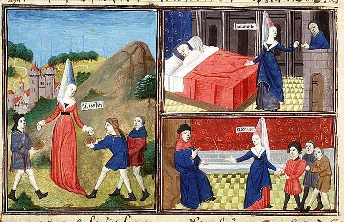 "Liberalità, Umanità e Benevolenza", miniatura tratta da 'Des faits et dits mémorables' (1462), Koninklijke Bibliotheek, L'Aia.