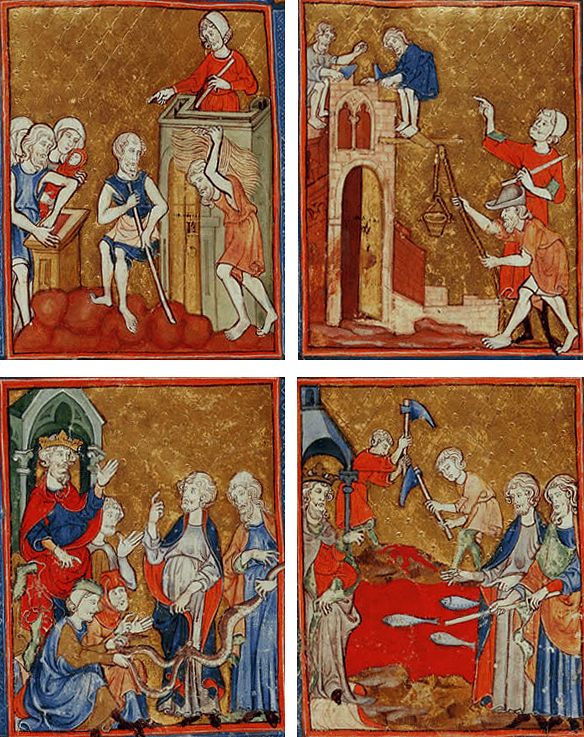 1. Dopo aver rifiutato a Mosè e Aronne di lasciar partire il popolo d'Israele, il Faraone inasprisce ancor di più le loro condizioni di vita: un egiziano munito di bastone sorveglia gli schiavi, mentre a sinistra un neonato sarà murato vivo.