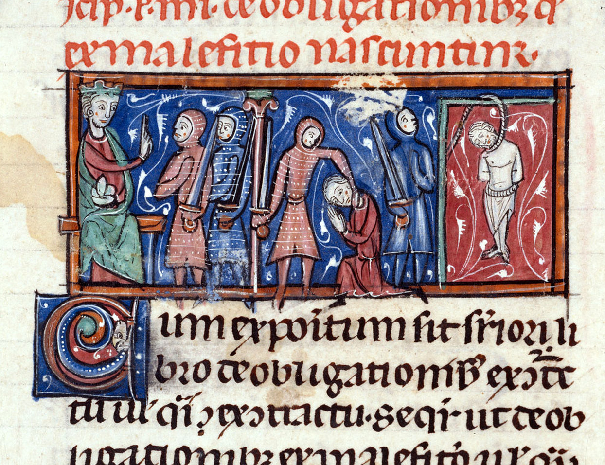 "L'imperatore ordina le esecuzioni", miniatura tratta dal codice 'Institutiones' di Giustiniano (terzo quarto del XIII secolo), Bibliothèque municipale, Troyes.