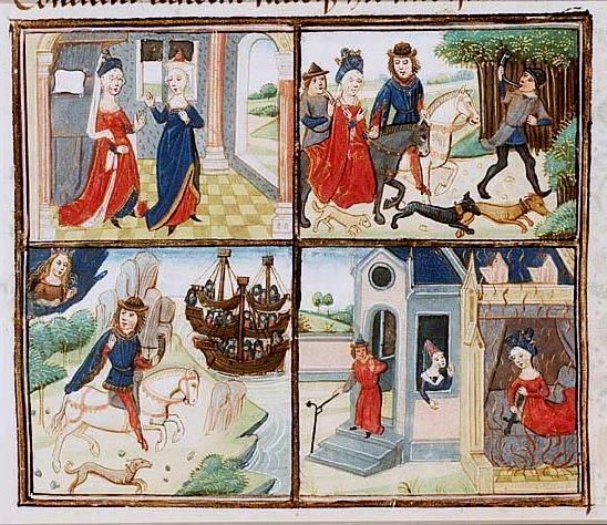 Kneeling knight received a swan-crested helmet from his lady, c. 1338-1344, manuscript…