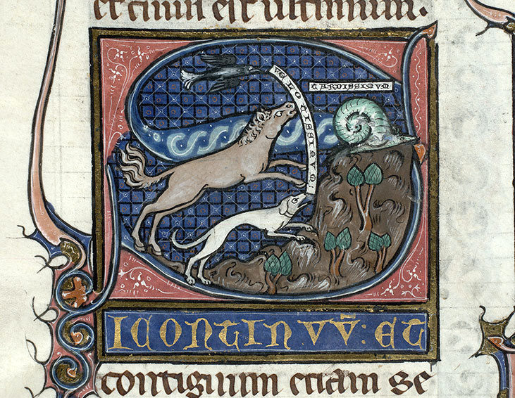 "Velocità e lentezza degli animali", miniatura tratta dall'opera 'Physica' tradotta da Guillelmus de Moerbeke (1280-1285), Bibliothèque Mazarine, Parigi. I due cartigli specificano che alcuni animali (come il levriero, il cavallo, l'uccello) sono "velotissimi", mentre altri (la chiocciola) "tardissimi".