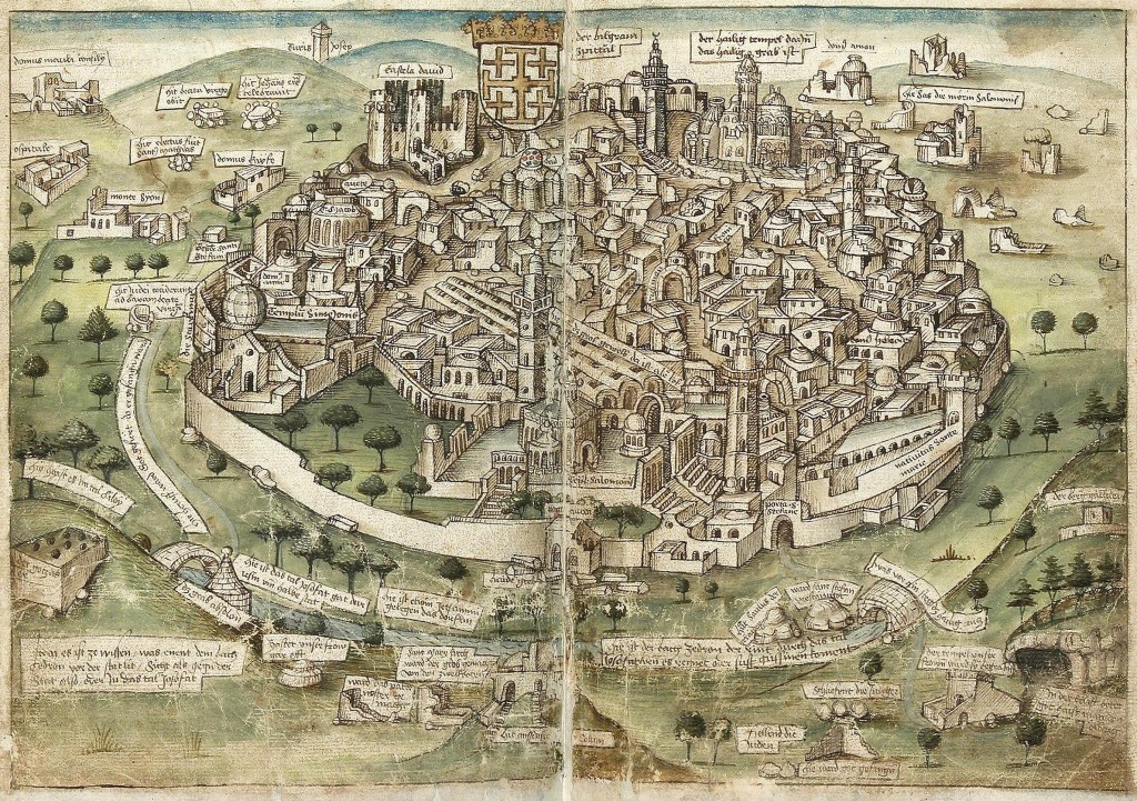 "Veduta di Gerusalemme", illustrazione tratta dall'opera 'Beschreibung der Reise von Konstanz nach Jerusalem' di Konrad von Grünenberg (1487), Landesbibliothek, Baden. Al centro si riconosce la Spianata delle Moschee (Templum Salomonis), mentre il castello a sinistra dello stemma è la Torre di Davide.