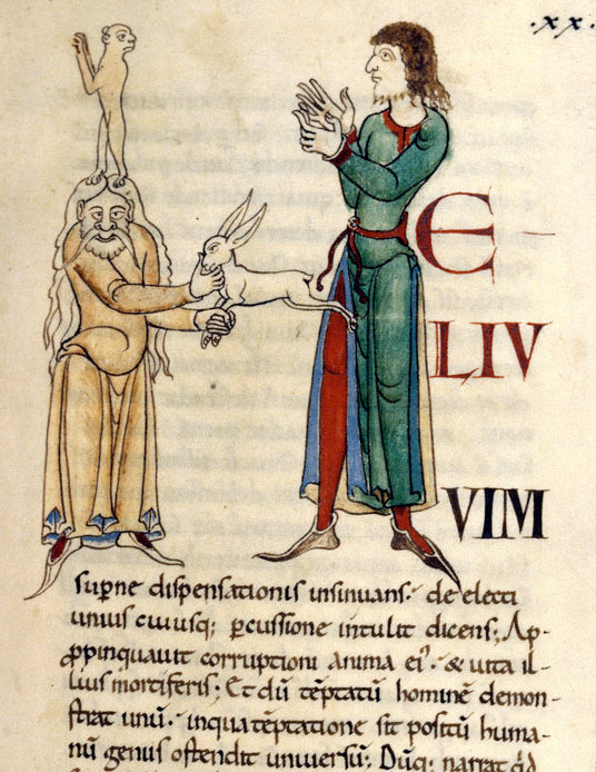Iniziale "H" composta da due giocolieri, uno dei quali ha una scimmia sulla testa, miniatura tratta da 'Moralia in Job' (inizi del XII secolo), Bibliothèque municipale, Digione.