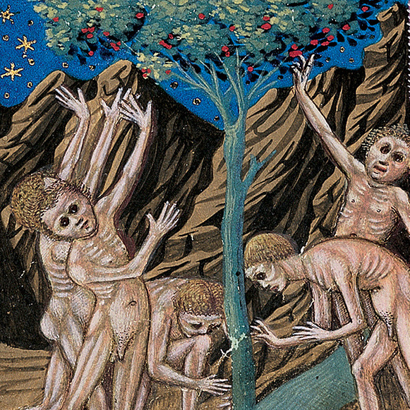 Magri da far paura: sono i golosi del Purgatorio, che Dante, Virgilio e Stazio incontrano in questa spettacolare miniatura.
