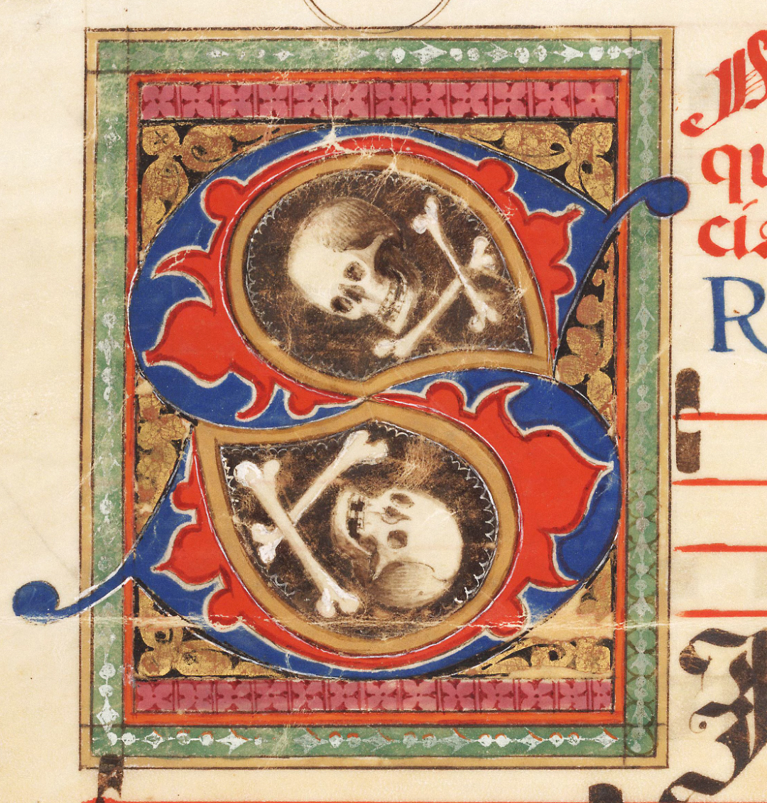 La miniatura ritrae due teschi umani iscritti all'interno di una lettera "S", quest'ultima dipinta in blu e rosso brillanti e ornata da sottili decorazioni bianche. Sullo sfondo, fregi dorati a fogliame a campo nero; il tutto racchiuso da ricche cornici rosse e verdi.