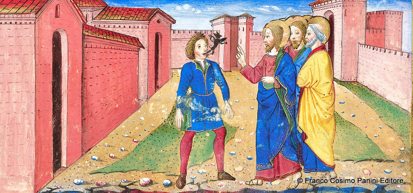 Cristo guarisce un lebbroso che gli si inginocchia davanti dicendo: “Meser, tu me poy bene mundare"... . ... mentre a Cafarnao libera un indemoniato, raffigurato mentre un diavoletto nero fugge dalla bocca. Miniature tratte dal 'Leggendario Sforza-Savoia' (Milano, 1476), Biblioteca Reale, Torino.