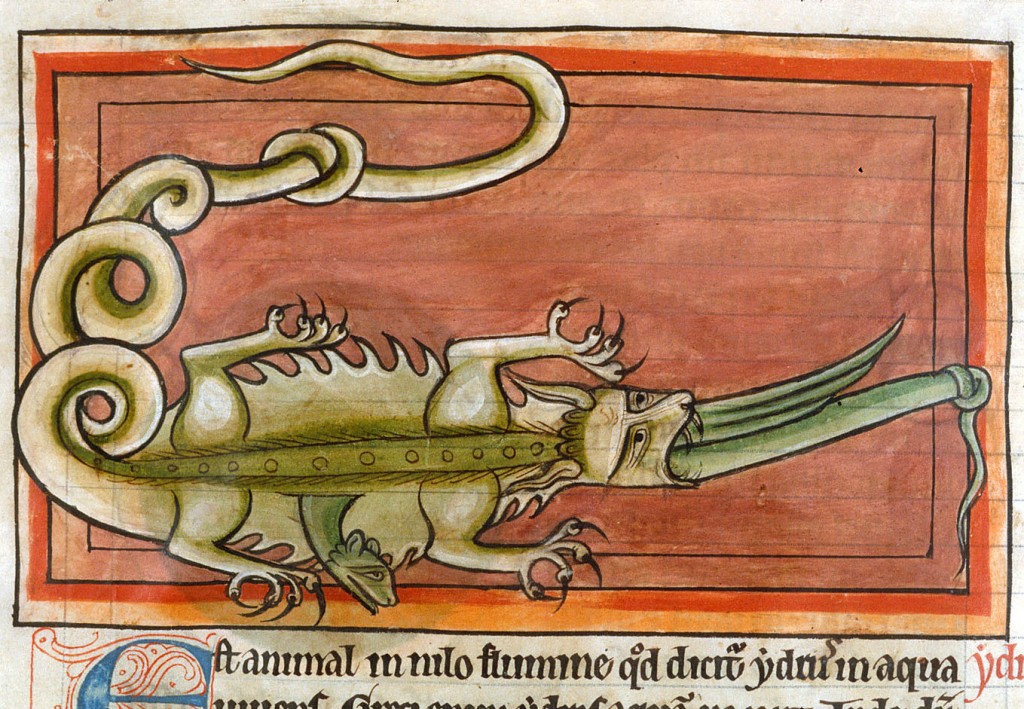 "Idra perfora con una delle sue teste il coccodrillo che l'ha inghiottita", miniatura tratta da Bestiario (secondo quarto del XIII secolo), British Library, Londra.