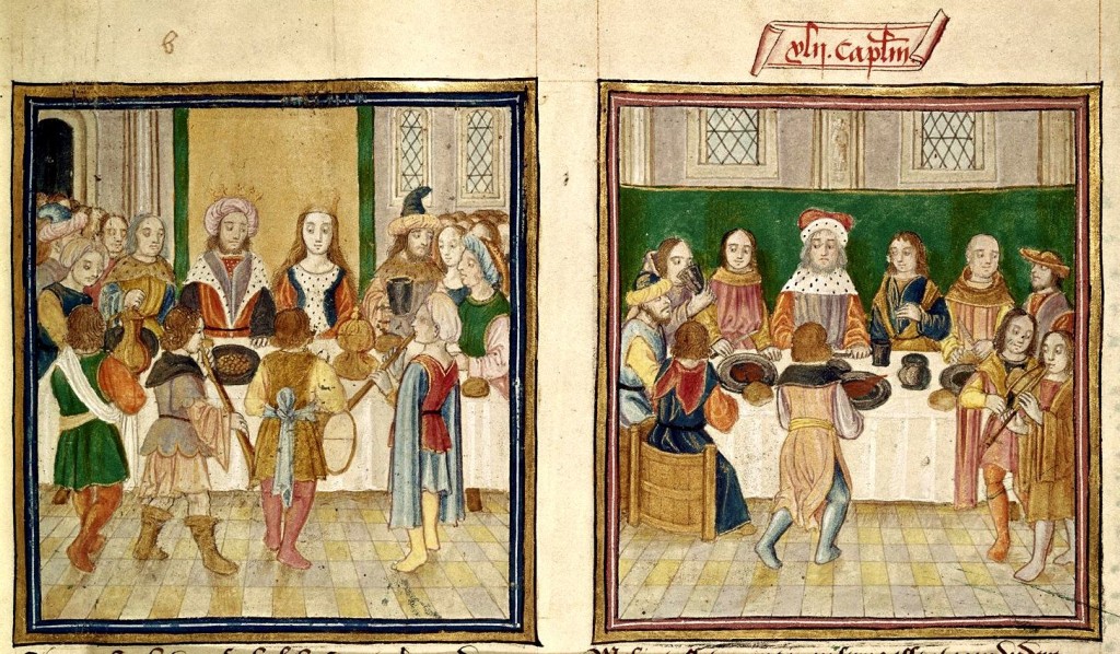 "Il banchetto di Assuero", illustrazioni tratte dal codice 'Speculum humanae salvationis' (1485-1509), British Library, Londra.