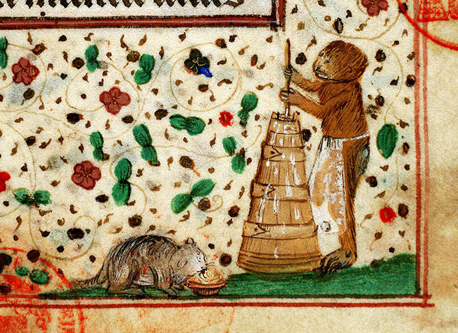 "Scimmia che fa la zangolatura del burro, mentre un gatto beve il latte", miniatura tratta da Libro d'Ore all'uso di Roma (fine XV secolo), Bibliothèque Mazarine, Parigi.