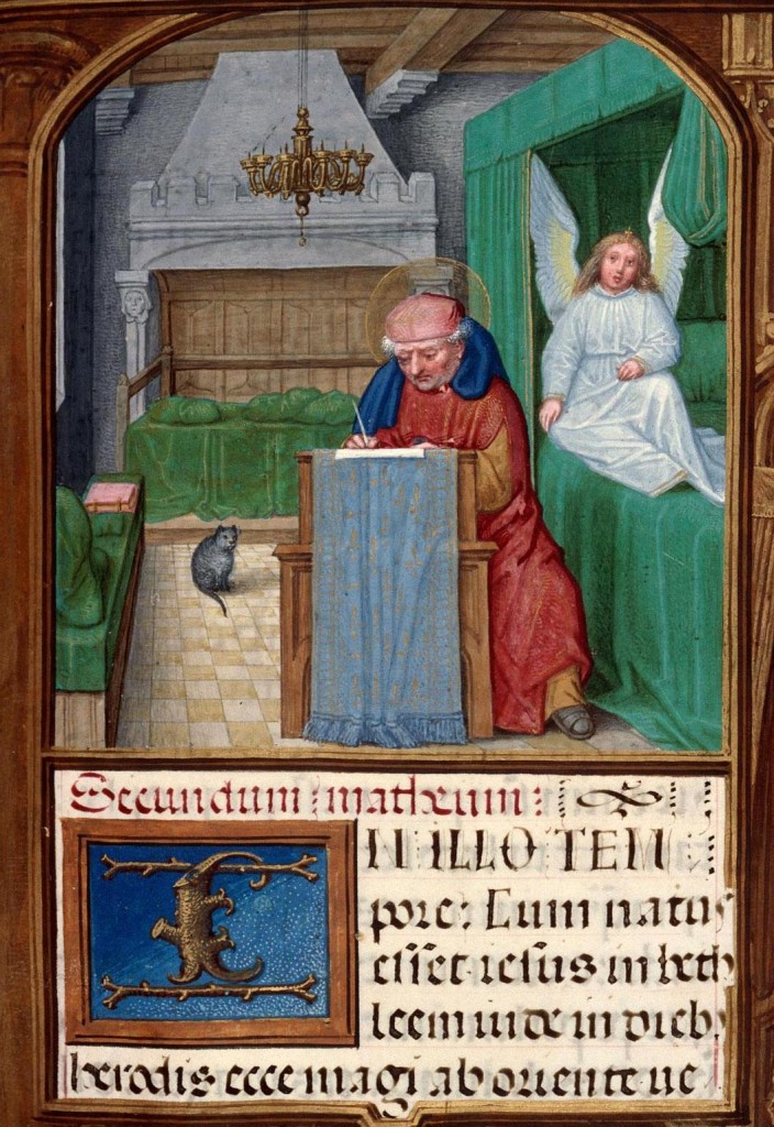 "L'evangelista Matteo ispirato dall'Angelo", miniatura tratta da Libro d'Ore (Bruges, 1510-1525), Bibliothèque municipale, Rouen.