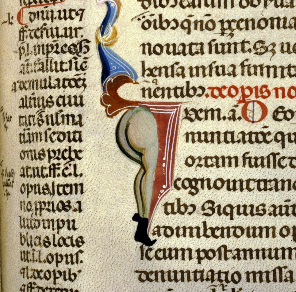 Iniziale "I" (Idem) composta da gambe umane e fondoschiena, miniatura tratta dal 'Codice di Giustiniano' (inizi del XIV secolo), Bodleian Library, Oxford.