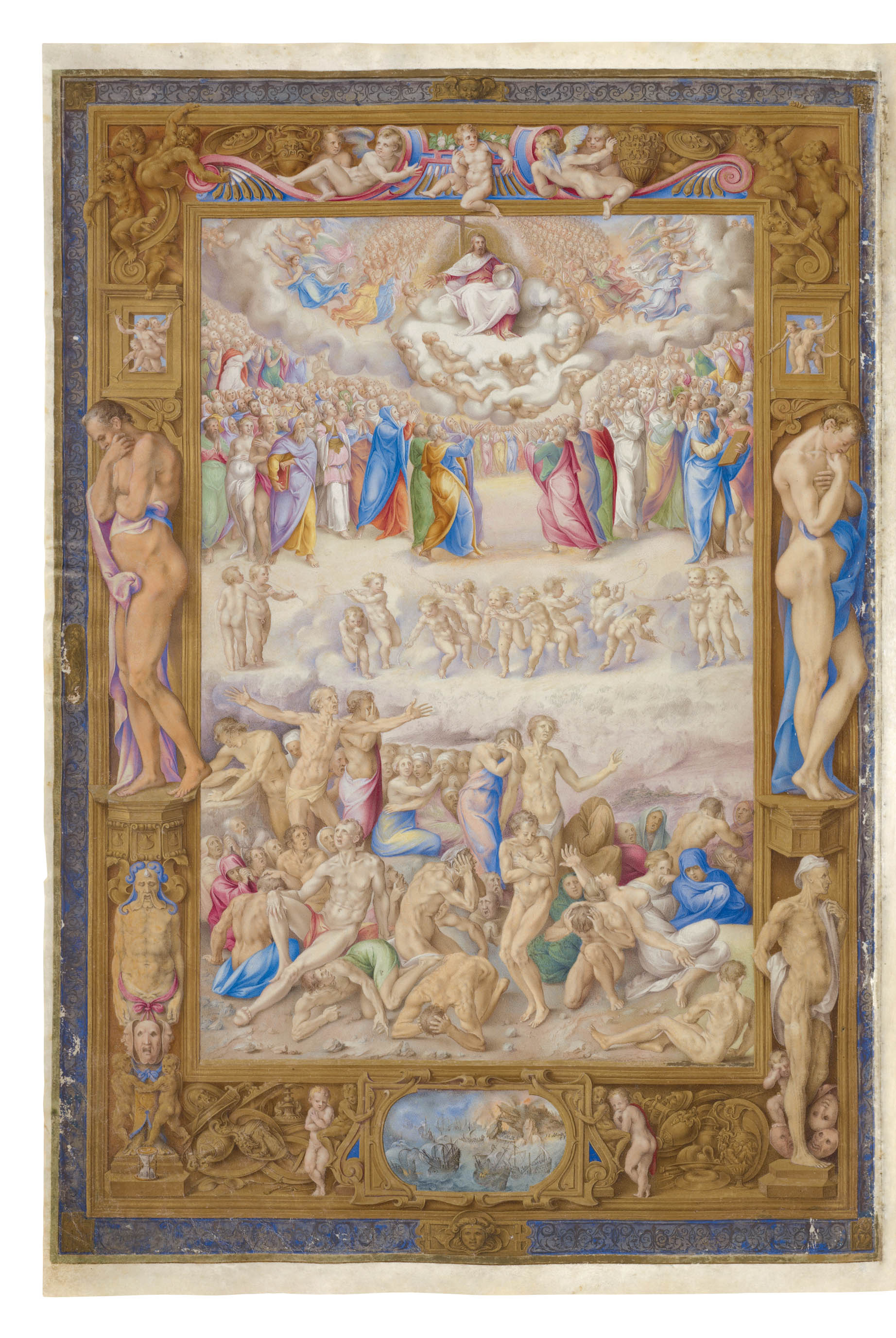 Tra le miniature del Lezionario più celebrate dai contemporanei, spicca quella raffigurante il Giudizio Universale. Clovio non poteva prescindere dall’affresco di Michelangelo, da cui discendono le pose di certe figure, la nudità dei corpi e la composizione vorticosa dell’insieme. Nella miniatura però volle mitigare la “terribilità” della scena (si notino gli angioletti danzanti e le vesti multicolore), ritraendo i dannati con accenti più pietosi rispetto al modello michelangiolesco.