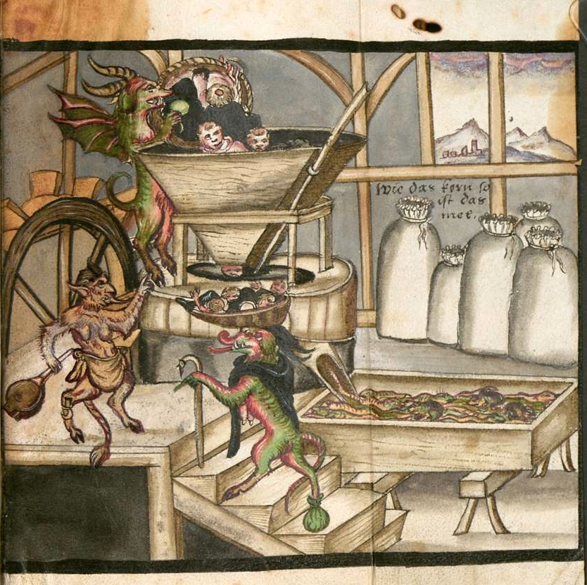 "Diavoli gettano i dannati nella macina di un mulino", illustrazione tratta da 'Sambucus, Johannes: Emblemata' (Anversa, 1564), Bayerische Staatsbibliothek, Monaco.