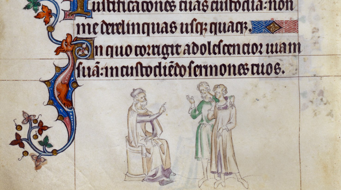 Detail of a bas-de-page scene of an assisted Valentine before a judge, with…