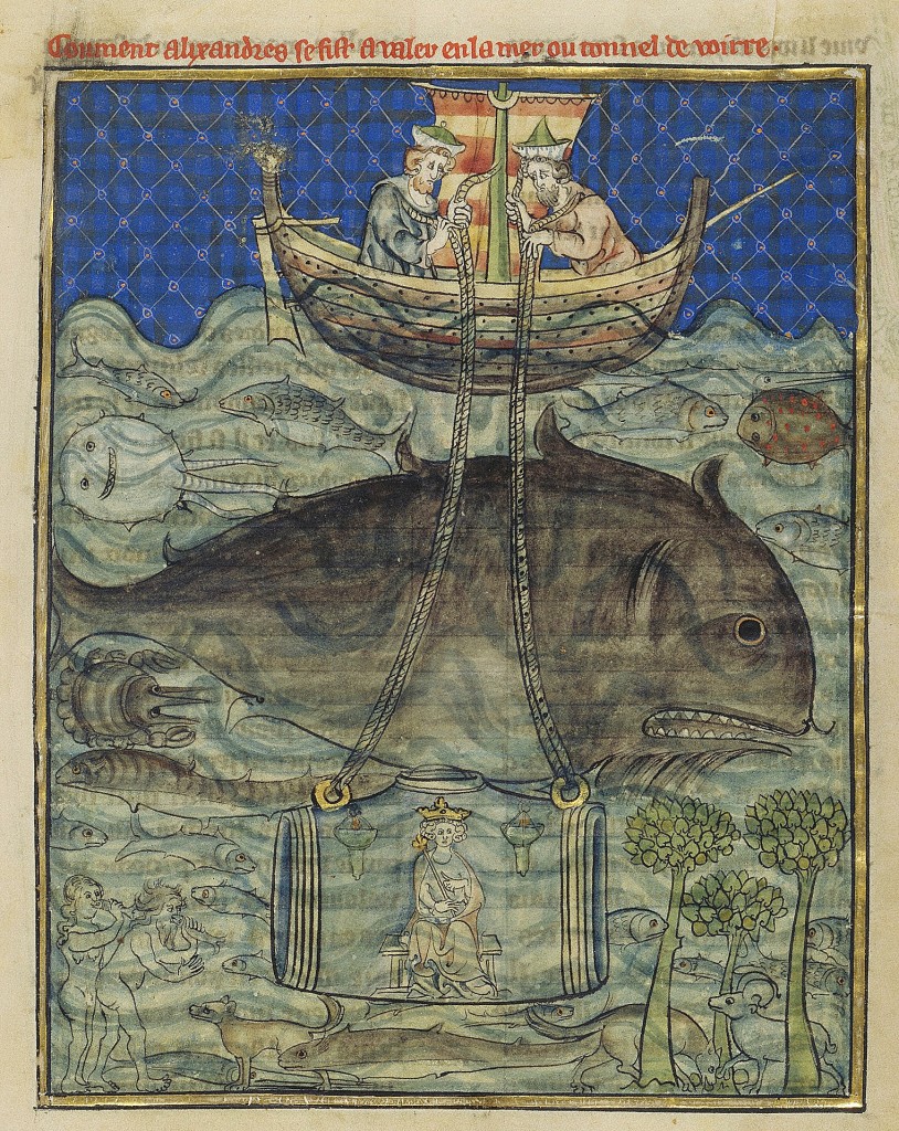 "Il sommergibile di Alessandro Magno", miniatura tratta dal codice 'Histoire du bon roi Alexandre' (1320), Kupferstichkabinett Staatliches Museum Preußischer Kulturbesitz, Berlino.