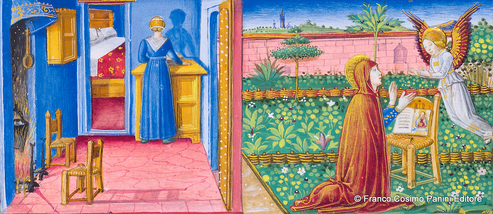 L’annuncio ad Anna. L’angelo si reca ad annunciare ad Anna la nascita di Maria e la trova in ginocchio che prega in giardino “con la ymagine davante”: un libro di orazioni posato su una sedia e aperto su una miniatura raffigurante Dio. All’interno della casa, la serva accudisce la cucina e prepara il pranzo: la luce del camino proietta sul pavimento e sui muri l’ombra di cose e persone.