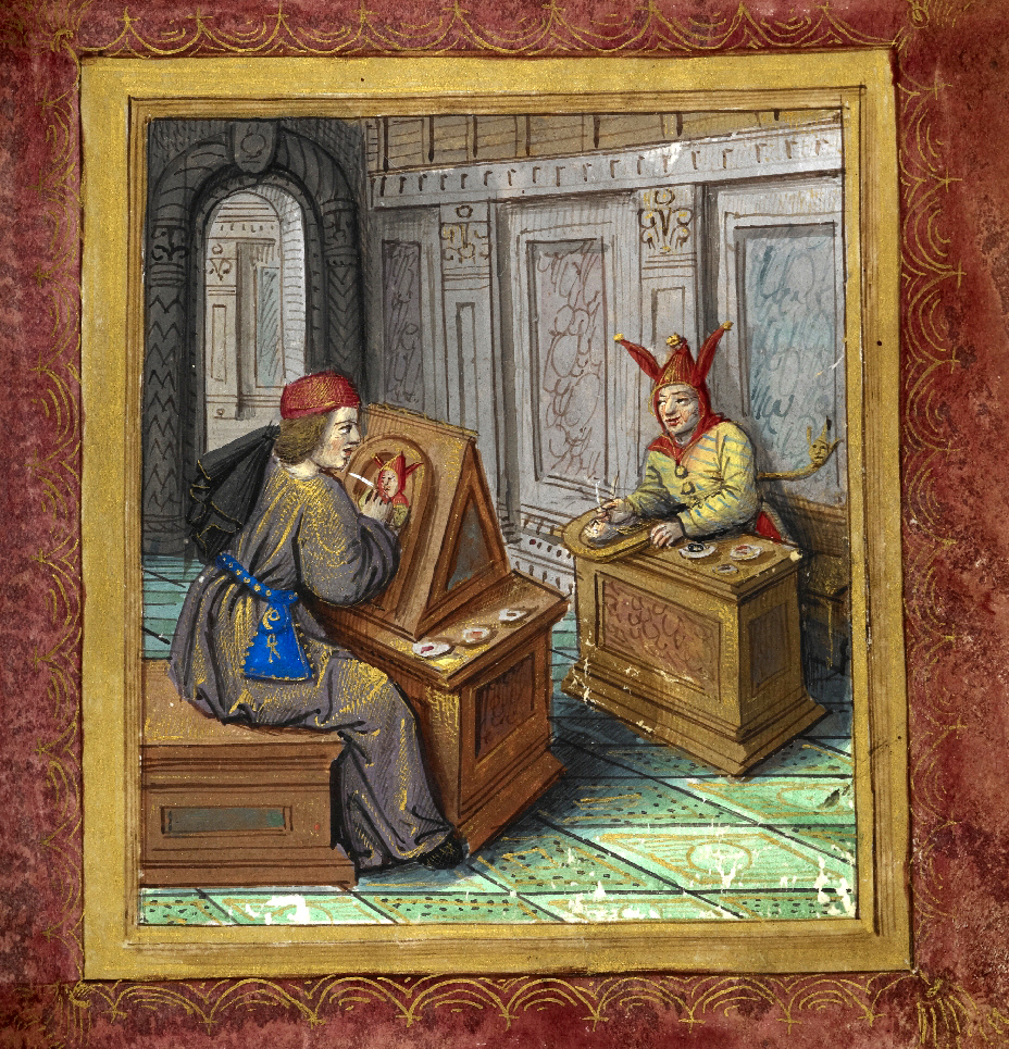 "Un pittore dipinge il ritratto di un giullare, che a sua volta ritrae il pittore", miniatura tratta dal 'Petit Livre d'Amour' di Pierre Sala (primo quarto del XVI secolo), British Library, Londra.