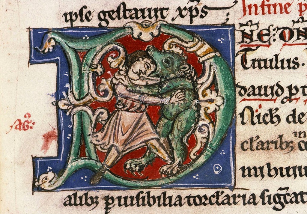 Iniziale "D" raffigurante "Lotta tra un uomo e un orso", miniatura tratta dal 'Commento ai Salmi' (seconda metà del XII secolo), Bibliothèque Sainte-Geneviève, Parigi.