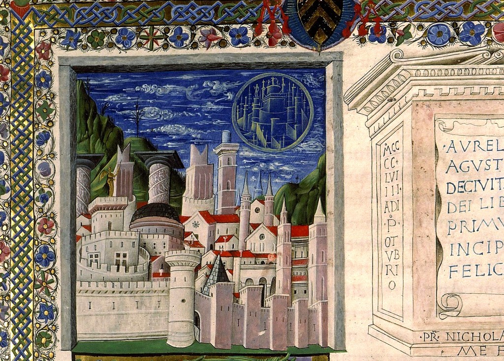 "La città di Roma", miniatura tratta da 'De Civitate Dei' (1459), Bibliothèque de Sainte-Geneviève, Parigi. Si riconoscono: la colonna di Marco Aurelio, la colonna di Traiano, Castel Sant'Angelo, il Pantheon, le mura del Vaticano, l'antica Basilica di San Pietro, la piramide Caio Cestio, le Torri "delle Milizie" e "dei Conti" e il Campidoglio.