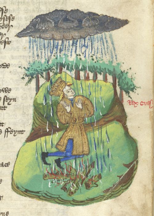 - Croesus kneels in a fire which is extinguished by the rain pouring from a cloud above, ms Harley 1766, c. 133r, IX century, British Library, London.