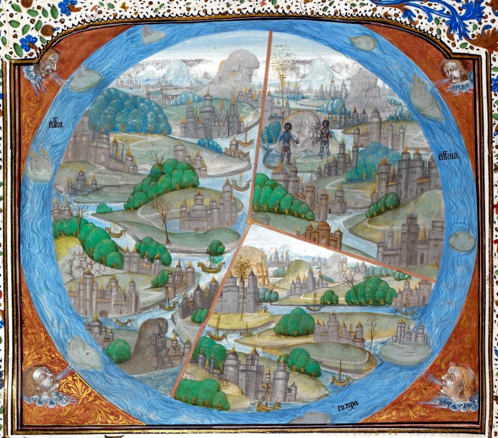 "Mappa del mondo diviso in tre parti: Europa (in basso), Asia (a sinistra) e Africa (a destra)", miniatura tratta dal 'Livre des proprietez des choses' (1482), British Library, Londra.