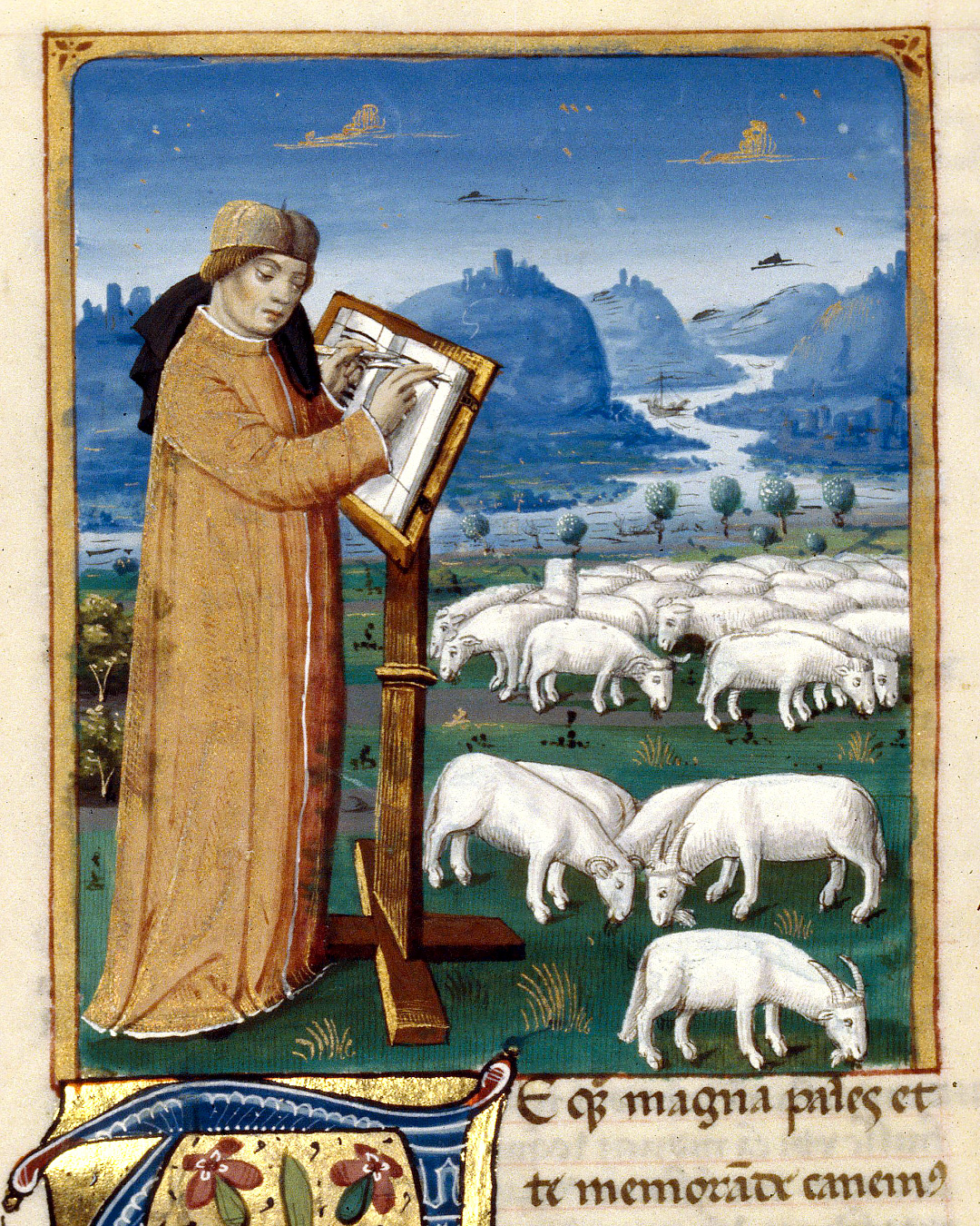 "Virgilio che scrive in un pascolo", miniatura tratta dalle “Georgiche” di Virgilio illustrate dal Maestro di Robert Gaguin, ms. 0493, c. 037v, fine del XV secolo, Bibliothèque municipale, Digione.