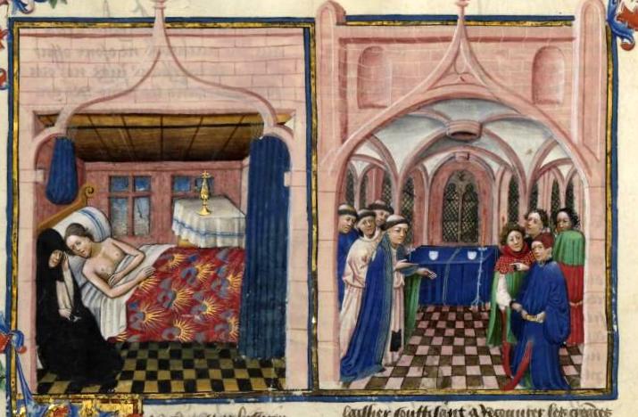 Prima giornata, prima novella: “Il peccatore Ser Ciappelletto s’ammala in viaggio. Prima di morire si finge santo, il prete confessore ne beatifica la memoria”. Miniatura tratta dal ‘Decameron’ (codice del XV secolo), Bibliothèque de l'Arsenal, Parigi.
