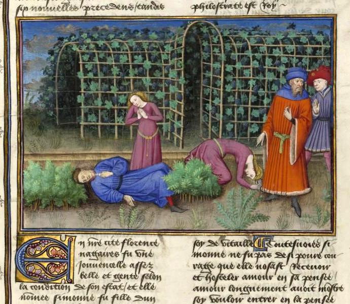 Quarta giornata, settima novella: "Simona ama Pasquino. Lui muore sfregandosi i denti con la salvia. Per discolparsi lei mostra come è andata e muore a sua volta". Miniatura tratta dal ‘Decameron’ (codice del XV secolo), Bibliothèque de l’Arsenal, Parigi.