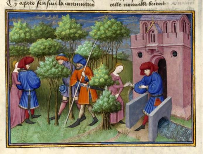 Quinta giornata, terza novella: "Pietro e l’Agnolella, in fuga per amore, sono separati da una banda di ladri. Si ritroveranno, per sposarsi e ritornare a casa". Miniatura tratta dal ‘Decameron’ (codice del XV secolo), Bibliothèque de l’Arsenal, Parigi.