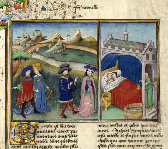 Terza giornata, sesta novella: "Con l'astuzia, Ricciardo seduce la bella Catella. Lei scoprirà l'inganno, ma la crede una bugia d’amore e si innamorerà di lui". Miniatura tratta dal ‘Decameron’ (codice del XV secolo), Bibliothèque de l'Arsenal, Parigi.