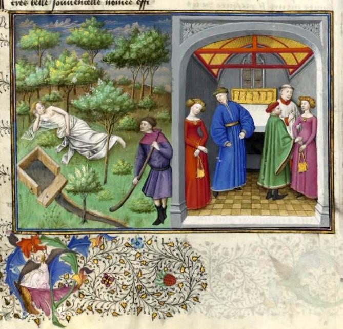 Quinta giornata, prima novella: "Cimone affina i suoi modi per amor d'Efigenia, non abbastanza da rinunciare a rapirla al promesso sposo per farla stare con sé". Miniatura tratta dal ‘Decameron’ (codice del XV secolo), Bibliothèque de l’Arsenal, Parigi.