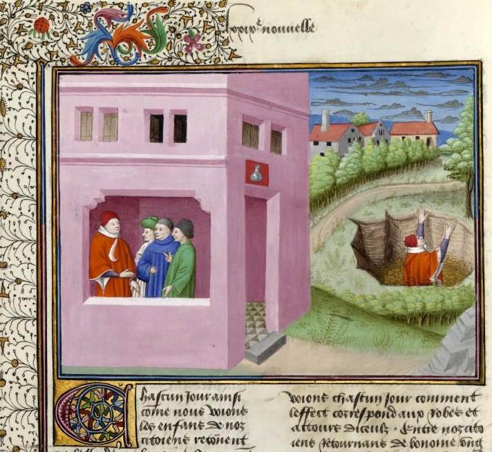 Ottava giornata, nona novella: "Un medico credulone, ruffiano e superbo, tenta di entrare in una fantomatica lieta brigata ma finisce scaricato in un letamaio". Miniatura tratta dal ‘Decameron’ (codice del XV secolo), Bibliothèque de l’Arsenal, Parigi.